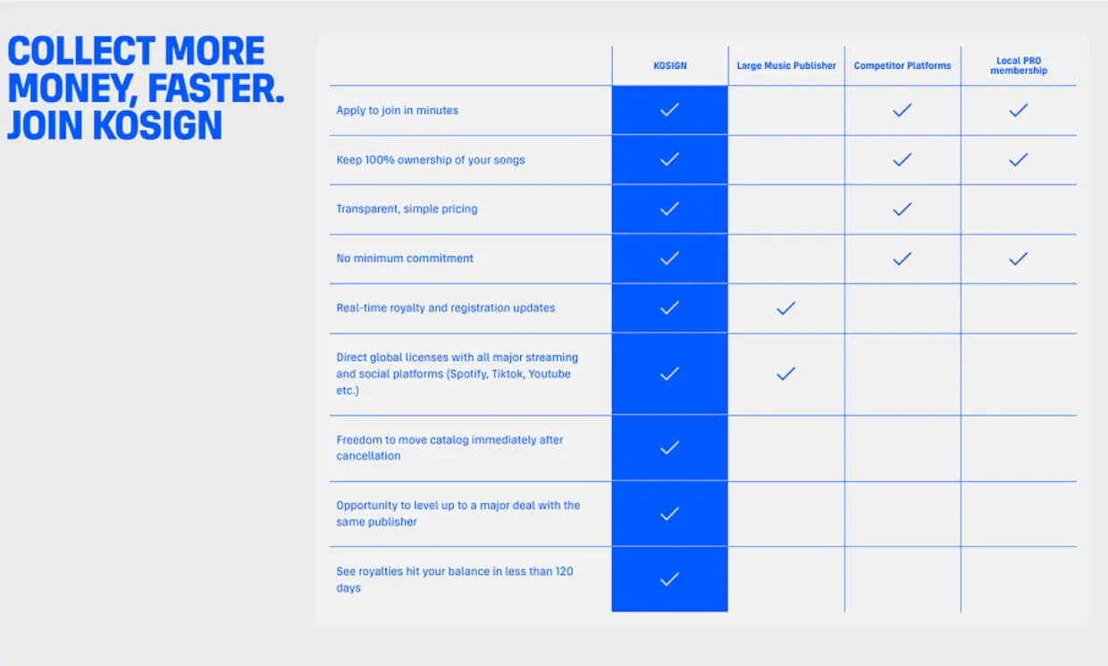 With no long-term commitments, a simple 80/20 split, full catalog control, and the freedom to leave anytime, KOSIGN delivers the best of both worlds—industry-leading publishing administration with total flexibility.